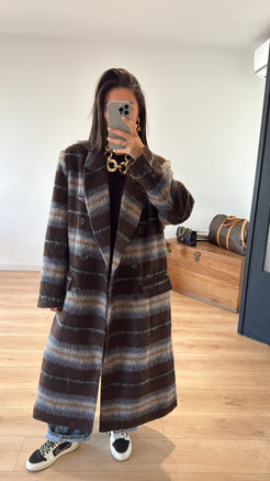 • Manteau long à rayures bleu, choco et beige